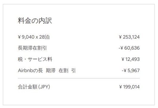 ただし、Airbnbで長期滞在する場合、月額割引が適用されるのはちょっとだけお得に滞在可能です。