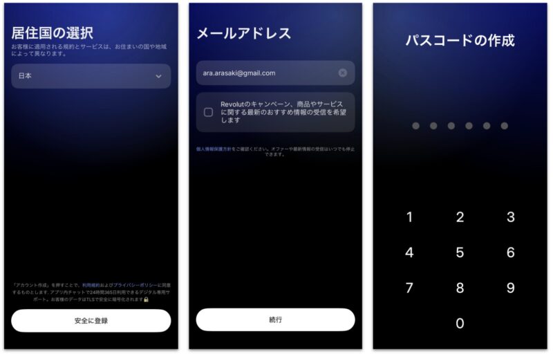 SMSに届く6桁のコードを入力してSMS認証完了後、「居住国」「メールアドレス」「パスコード」を登録します。