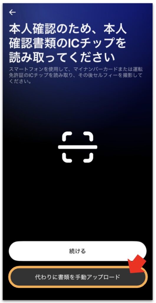 なお、本人確認方法は、「スマホカメラを起動させて運転免許証のICチップを読み取る」または、「運転免許証の写真を自分でアップロード」のいずれかを選択できます。