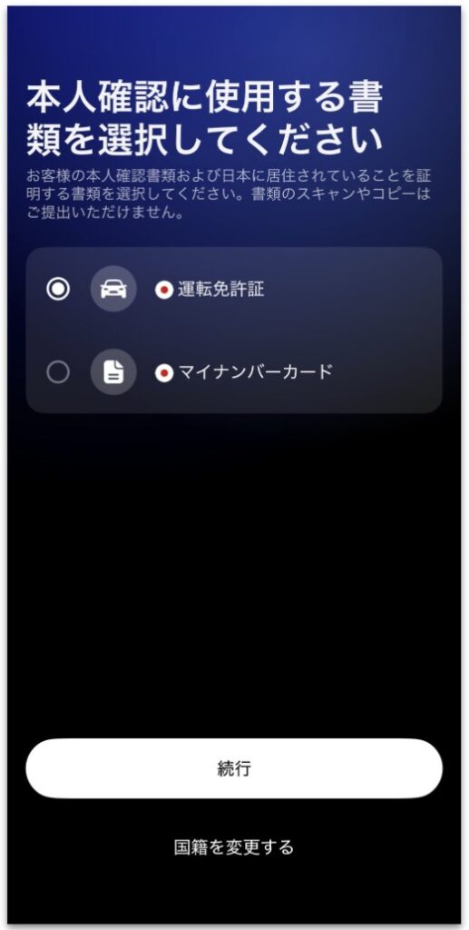 続いて、本人確認書類に登録された「氏名」を登録後、本人確認に使用する書類(運転免許証 or マイナンバーカード)を選択します。