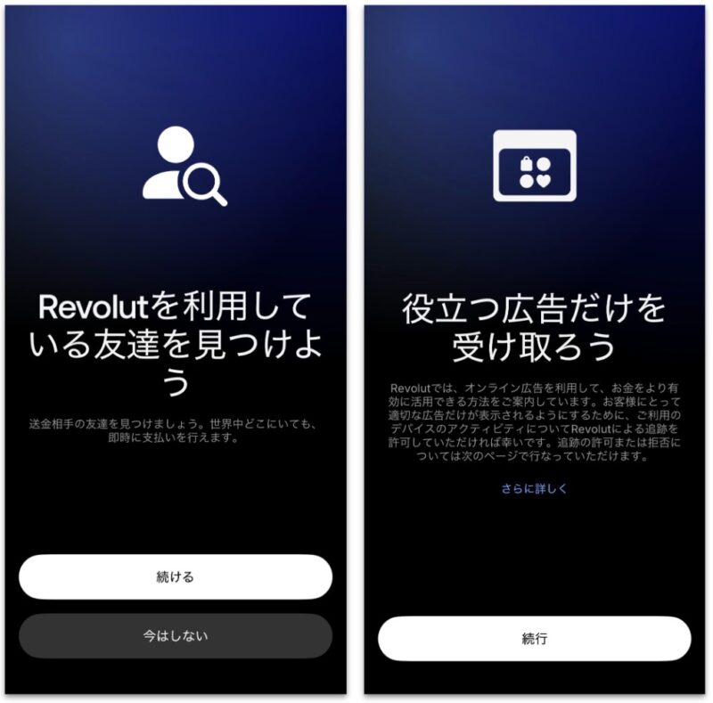 続いて、以下の「友達を見つけよう」や「役立つ広告だけ受け取ろう」などの設定が出てくるので、適当にタップしてください。