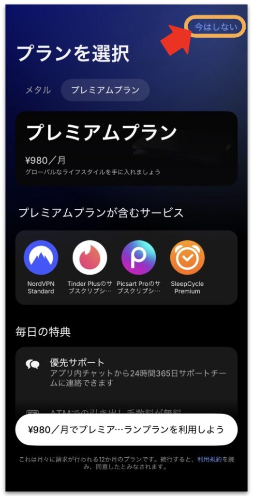 以下のように、有料プランをオススメしてくるので、「無料プランでOK」という方は、右上の「今はしない」をタップしましょう。