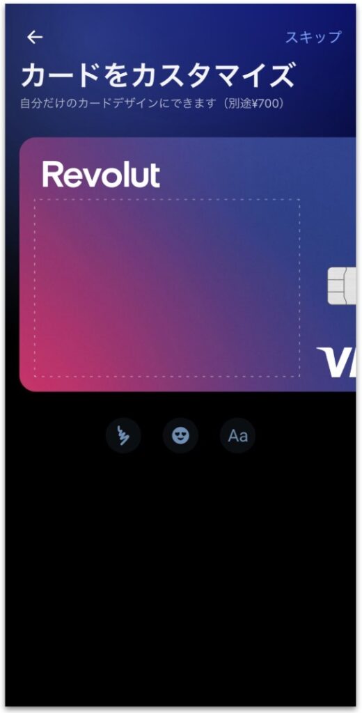 「カードを注文する」をタップすると、カードをカスタマイズする画面に映ります。特に必要ない場合は、右上の「スキップ」をタップしましょう。