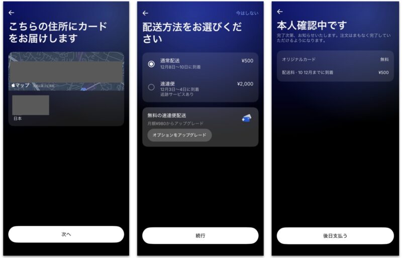 続いて、カード送付先住所の確認、配送方法を選択、そしてとりあえず「後日支払う」を選択します。