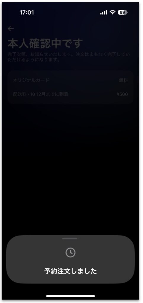 とりあえず、ここまででリアルカードの予約注文が完了しました。ただし、本人確認完了後にチャージ(支払い)が完了しなければ、リアルカードの配送を行なわれません。