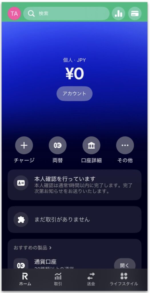 上のスクショは、まだアカウント作成したばかりなので、本人確認が完了しいない状況です。「本人確認を行なっています」というポッポアップが消えたら、チャージ可能です。