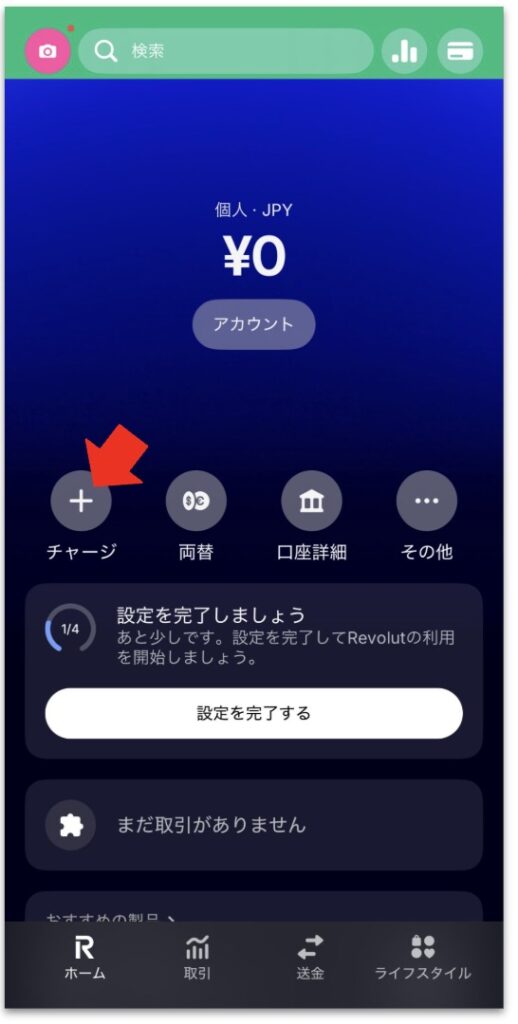 本人確認完了後、トップ画面の「+」をタップしてチャージ手続きします。