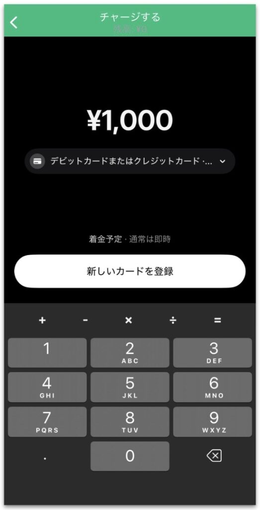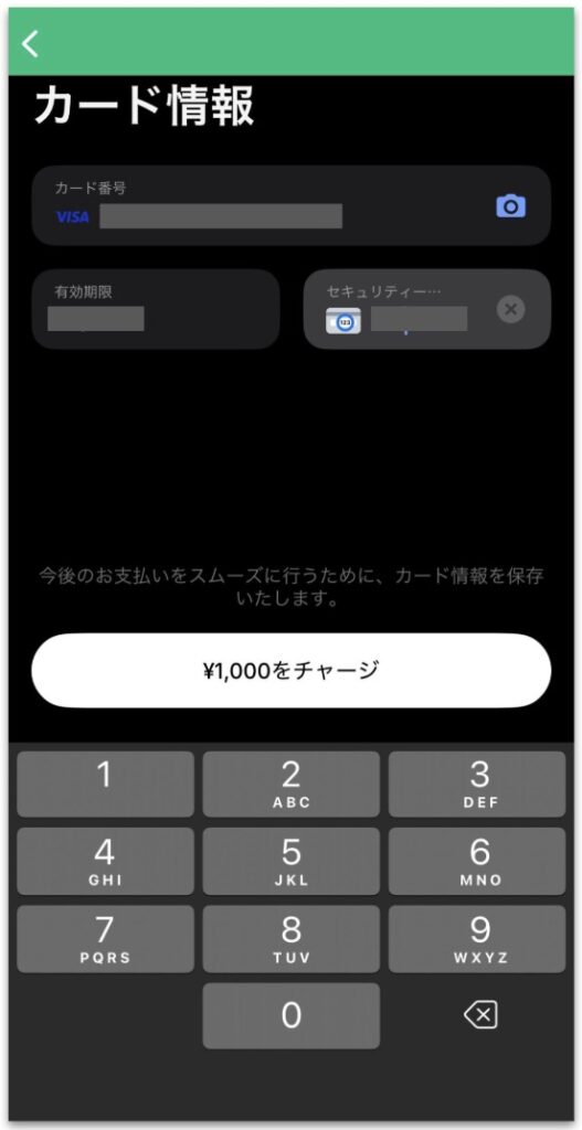 以下のフォーマットに従ってカード情報を入力し、「¥1,000をチャージ」をタップしてチャージ完了です。