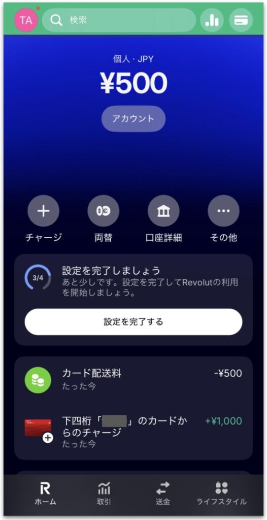 すると、Revolutには1000円チャージされると同時に、リアルカードの配送手数料500円の支払いが完了します。