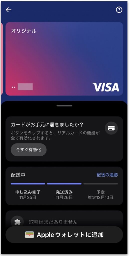 なお、リアルカードの配送状況はアプリ内でで以下のように確認できます。