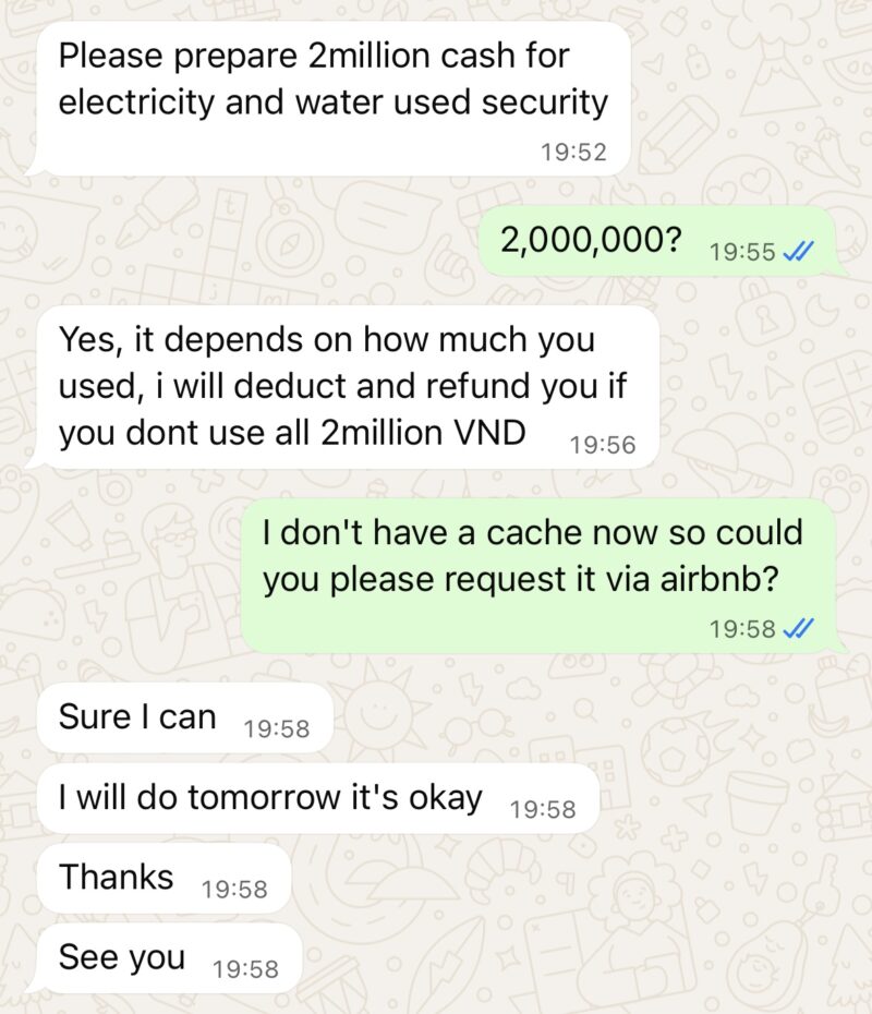 予約時に「電気代・水道代は別」とは説明がありましたが、チェックイン時に2,000,000VND(2 Million VND)を前払いして、チェックアウト時に清算、お釣りがあれば返却するという流れでした。